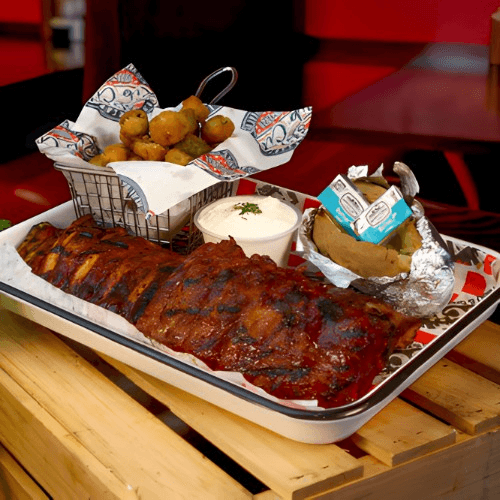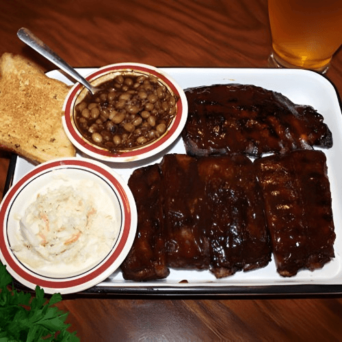 Baby back ribs, smoked pork, beef and chicken, 2 potatoes, 2 coleslaw, 2 BBQ beans and 2 garlic toast.