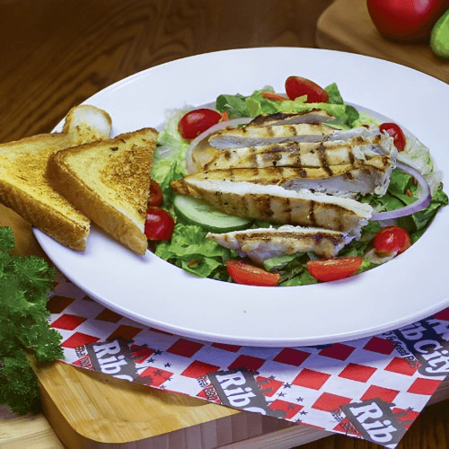 Topped with a grilled, sliced chicken breast. All our fresh garden salads are served with garlic toast & choice of housemade dressings bleu cheese, ranch, thousand island, honey mustard, fat free Italian or oil & vinegar. Top any salad with shredded cheese & bacon for an additional charge.