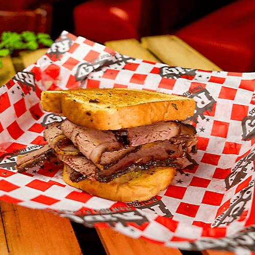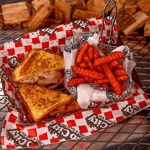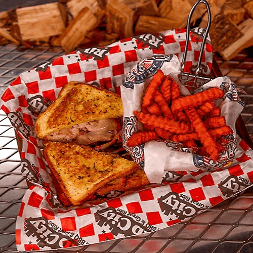 A jumbo sandwich with your choice of BBQ sliced beef, pork or smoked turkey breast, sliced thin, served piping hot on garlic toast. All skyscrapers are served with two signature sides.
