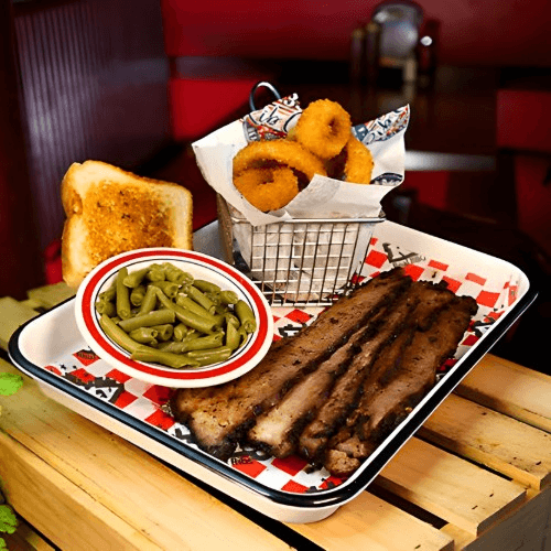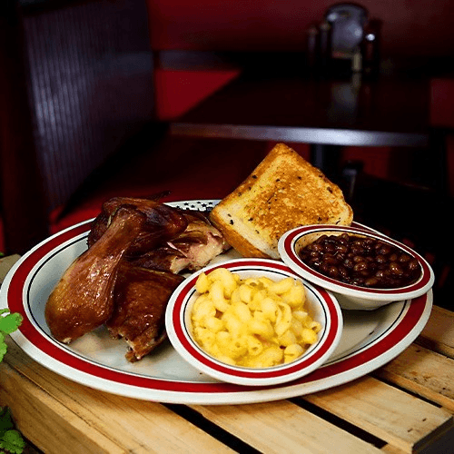 1/4 smoked chicken and tender, sliced pork or beef, your choice. Served daily from 11:00 AM - 4:00 PM with garlic toast and your choice of two signature sides.