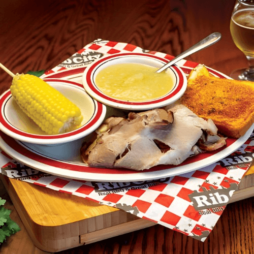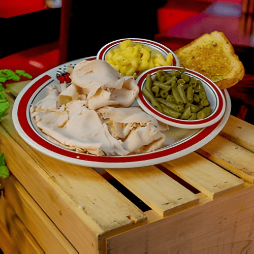 Boneless turkey breast, smoked until moist and tender. Served with garlic toast and a choice of 2 signature sides.