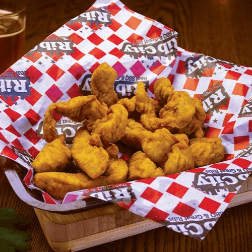 Always fresh never frozen. Served mild or hot, celery and choice of dressing.