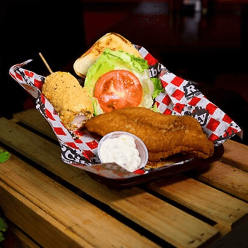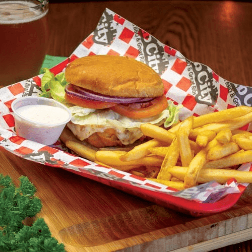 Hand breaded and fried to a golden brown, served on a large bun with lettuce, tomato, onion and housemade tartar sauce. All great sandwiches are served with one signature side. *These Items may be served raw or undercooked, or contain raw or undercooked ingredients. Consuming raw or undercooked meats, poultry, seafood, shellfish or eggs may increase your risk of a foodborne illness.