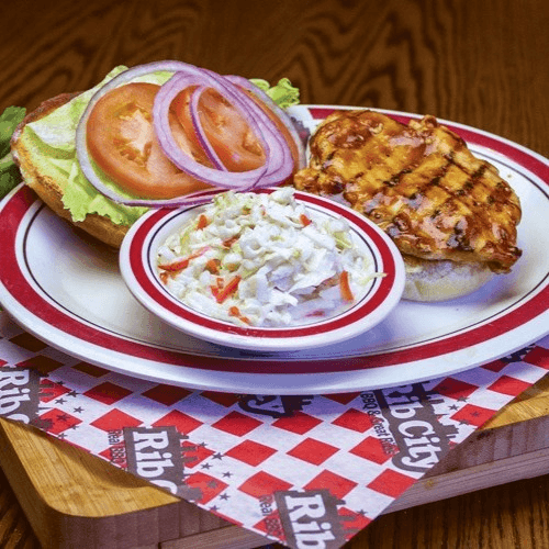 A fresh chicken breast, brushed with our sweet BBQ sauce and grilled, served on a large bun with lettuce, tomato and onion. All great sandwiches are served with one signature side.