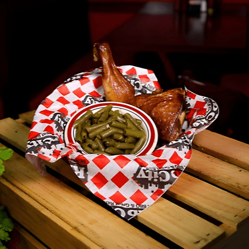 Two pieces of BBQ chicken. 10 years & under only. Meal comes with a kids drink & choice of two: green beans, mac & cheese, french fries, applesauce, corn cobette or mandarin oranges.