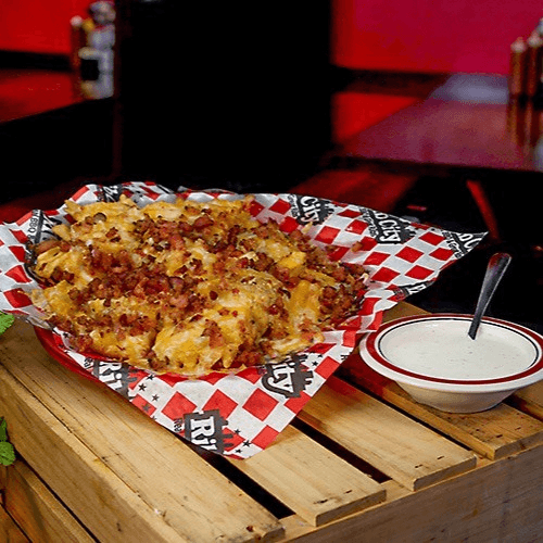 Super crispy waffle cut fries, covered in melted Monterey jack, Cheddar and pepper jack cheeses, topped with real bacon bits, served with spicy ranch for dipping. Serves 2-4 people.